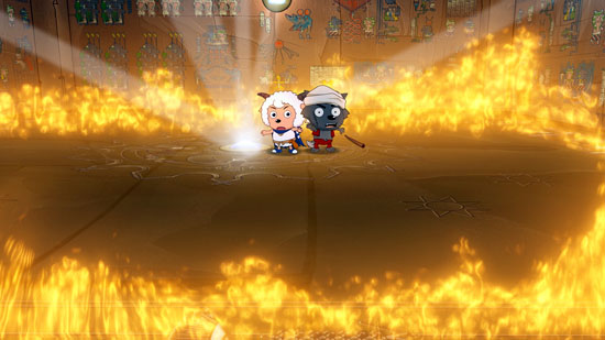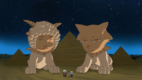 這次的劇情有一個很有趣的橋段,就是兩隻守護神都是大笨蛋,把埃及的獅身人面與希臘神話的Sphinx(史芬克斯)做了相當程度的連結,其實獅身人面在埃及可是很神聖的,在希臘神話中則是愚蠢的兇殘怪獸,聰明的喜羊羊當然三兩下就能解決他們出的難題(天上的星星到底有幾顆呢?聰明的你也來動一下腦筋吧!)。話說,這兩隻羊面獅身和狼面獅身還蠻可愛的。